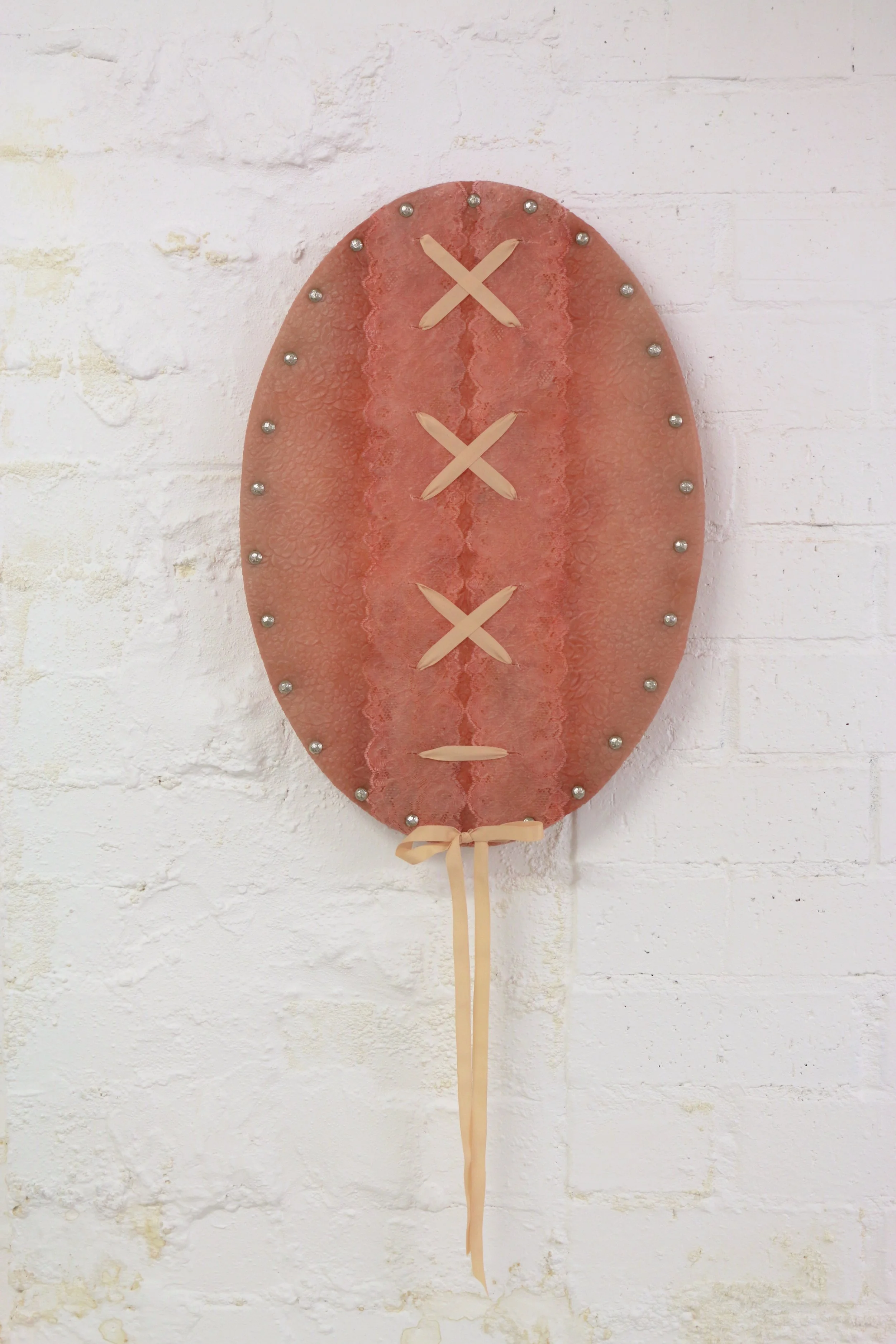 Prosthetic grade silicone, silicone paint, silicone sealant, stretch lace, polyester ribbon, nickel plated nails.